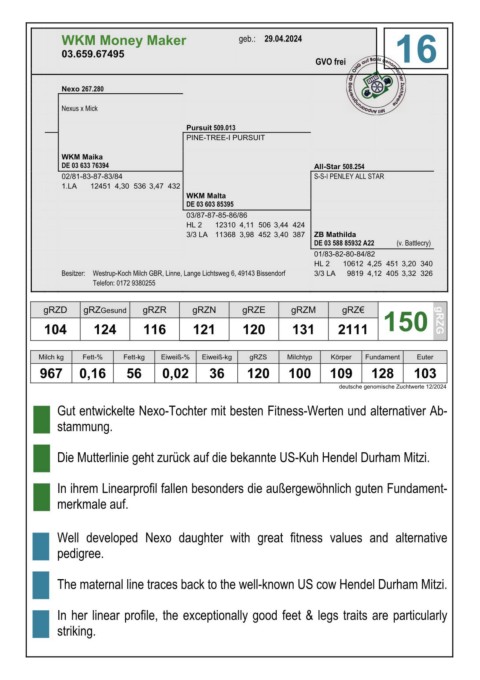 7 The maternal line traces back to the well-known US cow Hendel Durham Mitzi.